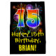 Este design de bolsa de presente de aniversário colorido, divertido e excitante apresenta um grande número "15" com um padrão inspirado no gradiente do espectro arco-íris, juntamente com a mensagem "Feliz 15 de Aniversário", e um nome de destinatário editável. Também tem um padrão de fundo colorido inspirado pela aparência de fogos de artifício comemorativos em explosão. Um saco de presentes temáticos de aniversário como este pode ser uma maneira divertida de embrulhar um presente ou presente para celebrar o décimo quinto aniversário de alguém. [~Z0000509]