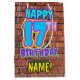 A frente desta design de bolsa de presente com tema de aniversário divertido apresenta a mensagem "FELIZ 17º ANIVERSÁRIO", tendo uma aparência vibrante, colorida e inspirada no grafite, juntamente com um nome de destinatário editável. O plano de fundo apresenta um padrão inspirado pela aparência de uma parede de tijolos. Uma bolsa de presente colorida de aniversário como esta pode ser uma maneira divertida de embrulhar um presente ou de apresentar a alguém que comemora seu 17º aniversário. [~Z0000536]