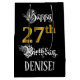 Esta design de bolsa de presente de aniversário elegante e opulente apresenta a mensagem "Feliz 27.º Aniversário", e um nome de destinatário personalizado. Parte da mensagem está em um texto luxuoso no estilo de script, o grande número "27º" apresenta um padrão de aparência falsa/imitado inspirado em ouro, e o fundo é preto colorido. Um saco-presente de rico como este pode ser usado quando embrulhar presentes que são dados a alguém em comemoração do seu 27º aniversário. [~Z0000560]