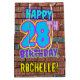 A frente deste design de presente temático de aniversário divertido apresenta a mensagem "FELIZ 28.º ANIVERSÁRIO", tendo uma aparência colorida, vibrante e inspirada em arte urbana e grafite, além de um nome de destinatário personalizável. O plano de fundo apresenta um padrão inspirado na parede do tijolo. Uma bolsa de presente vibrante como esta pode ser usada quando se dá um presente ou presente em honra do 28.º aniversário de alguém. [~Z0000536]
