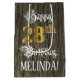 Este elaborado e rico de design de saco-presente temático de aniversário apresenta a mensagem "Feliz 28.º aniversário", além de um nome de destinatário personalizado. Parte da mensagem está no texto do estilo de script do ornamentado. O grande número "28º" apresenta um padrão de aparência falsa/imitado inspirado em ouro. O fundo tem uma imitação/padrão falsa inspirado em madeira. Um saco-presente como este pode ser usado quando se dá um presente ou presente em honra do 28º aniversário de alguém. [~Z0000562]