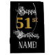 Este elaborado e rico de design de presente de aniversário com tema de aniversário apresenta a mensagem "Feliz 51ruas de Aniversário", juntamente com um nome de destinatário personalizável. Parte da mensagem está em um texto elegante no estilo script. O grande número "51ruas" apresenta um padrão de aparência falsa/imitado de inspiração dourada. O fundo é preto colorido. Um saco de presentes temático de aniversário de ornamentado como este pode ser uma forma respeitável de embrulhar um presente ou presente para celebrar o cinquenta primeiro aniversário de alguém. [~Z0000560]