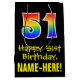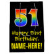 Este design de bolsa de presente colorida, divertida e excitante, com tema de aniversário, apresenta um grande número de "51" com um padrão de estilo de gradiente do espectro arco-íris, juntamente com a mensagem "Feliz aniversário de 51ruas", e um nome de destinatário personalizado. O fundo é preto colorido. Um saco de presentes temático de aniversário como este pode ser uma maneira divertida de embrulhar um presente ou presente para celebrar o aniversário de 51 ruas de alguém. [~Z0000512]