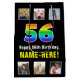 Este design de bolsa de presente, com tema de aniversário, otimista e divertido apresenta um grande número de "56", tendo um espectro de arco-íris vibrante inspirado em um padrão de gradiente, junto com a mensagem "Feliz 56º aniversário" e um nome de destinatário personalizado. As fotos acima e abaixo da mensagem podem ser personalizadas, talvez com fotos do receptor, da família e dos amigos do destinatário e/ou do(s) remetente(s) do presente. Um saco de presentes como este pode ser uma maneira divertida de embrulhar um presente de aniversário ou de apresentar a alguém que comemora seu quinquagésimo sexto aniversário. (Fotografia © Storytree Studios, Stanford, CA.) [~Z0000669]