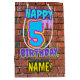 A frente desta design de presente de aniversário divertida apresenta a mensagem "FELIZ 5 BIRTHDAY", tendo uma aparência colorida, vibrante, de grafite e de arte urbana de rua inspirada, junto com um nome de destinatário personalizado. O plano de fundo apresenta um padrão inspirado pela aparência de uma parede de tijolos. Um saco de presentes temático de aniversário como este pode ser uma maneira divertida de embrulhar um presente ou presente para celebrar o quinto aniversário de alguém. [~Z0000536]