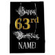 Este ornamentado de presente de aniversário elegante e design de presente de aniversário exibe a mensagem "Feliz 63º aniversário", e um nome de destinatário editável. Parte da mensagem está em um texto luxuoso no estilo de script. O grande número "63º" apresenta um padrão de aparência falsa/imitado inspirado em ouro. O fundo é preto colorido. Um saco-presente como este pode ser usado para dar um presente ou presente em honra do sexagésimo terceiro aniversário de alguém. [~Z0000560]