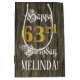 Este design de presente de aniversário opulente e rico apresenta a mensagem "Happy 63rd Birthday", juntamente com um nome de destinatário personalizado. Parte da mensagem está no texto do estilo de script do ornamentado. O grande número "63º" apresenta um padrão de aparência falsa/imitado inspirado em ouro. O fundo tem um padrão falsa/imitado de grãos de madeira. Um saco de presentes como este pode ser usado ao embrulhar presentes que estão sendo dados a alguém em comemoração de seus sessenta e três anos. [~Z0000562]