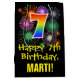 Este design de presente de aniversário empolgante, colorido e divertido apresenta um grande número "7" com um padrão de estilo de gradação do espectro arco-íris, juntamente com a mensagem "Feliz 7 Aniversário", e um nome de destinatário personalizado. Ele também tem um padrão de fundo colorido inspirado pelo olhar de fogos de artifício comemorativos que explodem. Um saco de presente temático de aniversário como este pode ser usado para dar um presente ou presente em comemoração do 7 de alguém. [~Z0000509]