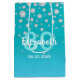 Uma bolsa de presente de 80 de aniversário elegante e glamourosa. Brilhante azul verde-lacrimejante cor verde-lacrimejante com borrifo de diamante sujo. Modelos para um nome, 80 anos e uma data. Data de nascimento ou data da festa/aniversário. Letras brancas e lacrimejadas. O nome é escrito com um script de estilo manuscrito.