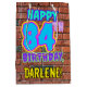 A frente desta design de bolsa de presente com tema de aniversário divertido apresenta a mensagem "FELIZ 84.º ANIVERSÁRIO", tendo uma aparência colorida, vibrante, grafite e arte urbana de rua inspirada, além de um nome de destinatário personalizado. O plano de fundo apresenta um padrão inspirado pela aparência de uma parede de tijolos. Uma bolsa vibrante como esta pode ser usada quando embrulhar presentes é dado a alguém em comemoração de seu oitenta e quarto aniversário. [~Z0000536]