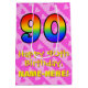 Este alegre, otimista e divertido design de presente de aniversário apresenta um grande número de "90" com um padrão de estilo de gradiente do espectro arco-íris, juntamente com a mensagem "Feliz 90 Aniversário", e um nome de destinatário personalizado. Também tem um padrão de fundo carinhoso que apresenta formas e listras cardíacas cor-de-rosa. Um presente feliz como este pode ser uma maneira divertida de embrulhar um presente de aniversário ou um presente que está sendo dado a alguém que está celebrando seu aniversário de 90. [~Z0000511]