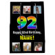 Este design de presente de aniversário otimista e atraente apresenta um grande número "92", tendo um espectro colorido de arco-íris inspirado em um padrão de gradação, junto com a mensagem "Feliz 92º Aniversário", e um nome de destinatário personalizado. As fotos acima e abaixo da mensagem podem ser personalizadas, talvez com fotos do receptor, da família e dos amigos do destinatário e/ou do(s) remetente(s) do presente. Um presente temático de aniversário como este pode ser uma maneira divertida de embrulhar um presente dado a alguém que está comemorando seu aniversário de noventa e dois anos. (Fotografia © Storytree Studios, Stanford, CA.) [~Z0000669]