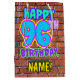 A frente desta design de bolsa de presente com tema de aniversário divertido apresenta a mensagem "FELIZ 96º ANIVERSÁRIO", tendo um olhar vibrante, colorido e inspirado no grafite, junto com um nome de destinatário editável. O plano de fundo apresenta um padrão inspirado pela aparência de uma parede de tijolos. Um presente vibrante como este pode ser usado ao embrulhar presentes sendo dado a alguém em comemoração de seu 90° aniversário. [~Z0000536]
