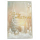 A serene and elegant Christmas artwork featuring soft pastel tones of gold, cream, and white. The scene depicts a glowing candle surrounded by delicate ornaments, frosted pine trees, and snow-covered foliage. An ethereal angel hovers above, radiating light and warmth. The golden text “Merry Christmas” sits gracefully in the center, complementing the peaceful, dreamy atmosphere of the piece.