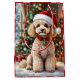 An adorable Christmas gift bag with a festive poodle sitting in front of the fireplace on a cold winter day. A Christmas tree decorated and a festive background.