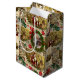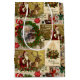 This design features a repeating Christmas pattern that looks like old-fashioned wrapping paper. It displays classic pictures of Santa Claus in his red suit standing next to a reindeer, along with large green holly wreaths tied with red ribbons that circle a snowy winter scene. The design is filled with traditional holiday details like lit candles, scrolls with greetings like "A Happy Christmas Tide," and warm colors that create a cozy and festive feeling.