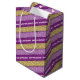 Adicione o aniversariante ou a idade da menina a esta bolsa colorida de presentes com uma reviravolta moderna numa banda Celta. Use "Personalizar esta modelo" para ajustar o texto "Feliz 28 de aniversário!" para a sua idade e mensagem preferidas. O texto branco senta sobre tiras de amarelo, lilás e roxo sobre uma púrpura escura.