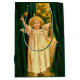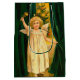 Vintage illustration of a lovely angel with white feather wings and golden hair, ringing the bell for Christmas time. On the background behind the dark green curtains is a nostalgic Christmas tree with bright burning candles.