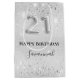 Elegante, clássico, glamouroso e feminino para uma festa de aniversário de 21 anos. Um fundo prateado. Decorado com pó de brilho. Personalize e adicione um nome. Com o texto: Parabéns. O nome é escrito com um moderno estilo escrito à mão. O número 21 é escrito com uma fonte no estilo do balão.