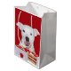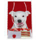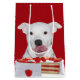 O terrier branco do pitbull lambe seus lábios sobre um bolo da morango, provavelmente um bolo de aniversário mas poderia ser todo o saco do presente dos amantes do cão da ocasião do partido
