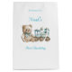 Bonito a bordo para um cheio de alegria e maravilha! Convide amigos e família para o seu primeiro aniversário com o nosso adorável Bebê Garoto Primeiro Aniversário Gift Bag. Este charmoso design apresenta um ursinho de pelúcia bonitinho agindo como um trem alegre, um trem azul com um urso-do-Teto sentado no trem, trazendo um toque lúdico e nostálgico para o dia especial do seu filho.