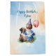 Um doce saco de presentes de primeiro aniversario personalizável para a festa de aniversário de um menino. Este tem um tema doce de um menino pequeno segurando um balão sentado ao lado de seu cachorro. É feito com um estilo aquoso de aquarela por ai. Então, se o melhor amigo do seu filho é o cachorro dele, este tema será perfeito para você.