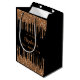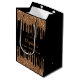 Um saco de presente para um aniversário de 21 ruas (ou qualquer idade) feminino e glamouroso. Um fundo preto com brilho dourado falso pingando, pintura pingando. Personalize e adicione uma data, nome e idade 21. O nome é escrito com um script de estilo manuscrito de tendência. Pode ser usado tanto para embrulho de presente quanto como saco de favores de festa.