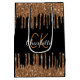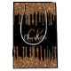 Um saco de presente para um aniversário de 21 anos (ou qualquer idade) feminino e glamoroso. Um fundo preto com gotas de brilho dourado falso, aparência de tinta pingando. Personalize e adicione um nome e letras de monograma. O nome é escrito com um estilo de letra manuscrita moderno.