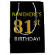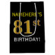 Este simples design de presente de aniversário apresenta uma mensagem personalizada como "NAMEHERE'S 81rua BIRTHDAY!" (com a "81ruas" a ter um visual falsa/imitado de cor dourada) sobre um fundo de cor preta. O nome está em texto em negrito de cor amarela e pode ser personalizado. Uma bolsa de presente de aniversário personalizada como esta poderia talvez ser usada quando se dá um presente a alguém que comemora seu oitenta aniversário. [~Z0000252]