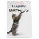 Cinza por gato com confete do partido sobre fundo branco e texto de Parabéns Feliz. A cor branca do fundo pode ser alterada.