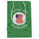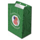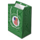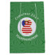Saco de presente médio apresenta um anjo de cabelo vermelho vestindo a bandeira dos Estados Unidos da América para decoração de presentes de Natal ou decoração de Natal. O anjo da bandeira americana de Natal é encontrado dentro de um fractal circular branco de quadrados ondulados. O fundo é um fractal verde de quadrados ondulados. Adicione seu próprio texto ou personalize com um nome e o ano.