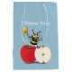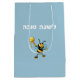 Uma abelha de mel bonita segura um pau de mel pingando com mel. O texto diz Shana Tova em inglês e em hebraico, L'Shana Tova. Você pode personalizar este cartão facilmente alterando a cor do plano de fundo e/ou alterando o texto em inglês ou excluindo o hebraico.