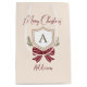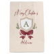 Apresente seus presentes em estilo com esta bolsa de presente de feriado monograma personalizada. A elegante design, desenhada à mão, apresenta uma crista festiva com prigos eververdes e um arco riscado rústico, tocado por um "Feliz Natal". Personalize facilmente a bolsa com um nome e uma inicial de monograma para criar embalagens especiais para o seu presente. Todas as cores são editáveis (basta editar os dois lados). © Kimbellish, LLC