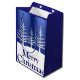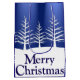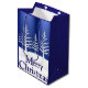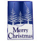Saco de presente de Natal médio com silhuetas de pinheiro branco em colinas de neve contra um céu azul de meia noite e saudação de "Feliz Natal".