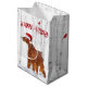 Cão-atirador irlandês vestindo um chapéu de Papai Noel em flocos de neve e pássaros.