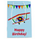 Está aqui um saco bonito do presente que você possa personalizar para um rapaz pequeno. Caracteriza uma imagem colorida do avião com uma bandeira da flâmula acima dele. As cores usadas são vermelhas, azuis, verdes brilhantes, e ouro. Abaixo da imagem é seu texto feito sob encomenda no vermelho brilhante, e colocado em uma luz - fundo azul. A parte traseira do saco repete a imagem e tem um texto adicional para você personalizar. Aperfeiçoe para o aniversário de um rapaz pequeno, mas você pode mudar o texto para toda a ocasião.