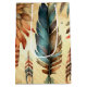 Aztec boho nativo americano, a aquarela tribal, design de penas azuis turquesas, girassóis abstrato e formas geométricas num fundo de areia deserto.