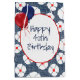 Flores brancas com centros vermelhos em tecido jean azul e balões para aniversário de 40 anos. A idade pode ser alterada.