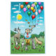 Feliz homem careca envia balões para o ar enquanto os animais olham.