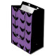 A imagem de design do Gift Bag de Medium Size Party com Bat Preto, de TheFabricSeal no Zazzle, é um morcego preto simples e bonito com cores de fundo do estilo silhueta de desenho das ilustrações do Dia das Bruxas de Laranja e do Halloween Púrpura, com o peekaboo a tocar verde khaki e os olhos laranja de abóbora olhando para amigos e presas, e uma legal noite de Halloween de aventura, goblins, fantasmas e fantasmas.