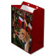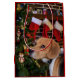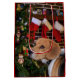Cachorro beagle se posiciona e resiste à tentação em frente a todo brinquedo de cachorro que parece decorações de Natal cão ama saco de presentes de Natal