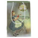 Saco verde médio de presente brilhante com uma imagem antiga Alice no País das Maravilhas, na frente, de Alice parada numa mesa à luz de um candelabro floral, segurando a famosa garrafa "beba-me". Veja como combinar um grande saco de presentes, confetti, bolsa de favor, etiqueta de presente, etiqueta e papel de embalagem. Veja toda a coleção Wonderland Gift Bag nos TOUCHES ESPECIAIS | Seção Favoritos para festas.