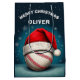 Bola de Baseball Red Santa Hat Nome de Natal Saco de Presente Médio. O design tem uma bola de beisebol com um chapéu vermelho de Papai Noel num fundo de inverno com flocos de neve brancos. Personalize com seu nome. Você pode mudar o texto Feliz Natal. Excelente para alguém que ama esportes.