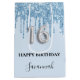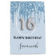 Elegante, clássico, glamouroso e feminino para uma doce 16, 16 festa de aniversário. Um bebê azul-tenente, fundo azul-claro. Decorado com pingos de brilho sujo, aparência de pingar tinta. Personalize e adicione um nome. Com o texto: Parabéns. O nome é escrito com um moderno estilo escrito à mão. O número 16 é escrito com uma fonte no estilo do balão.