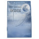 Uma bolsa de presente de aniversário com um céu de fantasia mágico com nuvens azuis e uma lua grande e bonita. 2 cisnes brancas voando juntas.