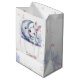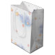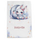 Saco de presente super bonito com um belo coelhinho branco vestindo um belo arco rosa e uma lua prateada crescente com algumas estrelas douradas caindo.