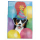 Feliz aniversário saudações com esta design com um fofo e festeiro cão Bernese Mountain Dog, que veste chapéu, rodeado por balões coloridos, confetti e Streers.