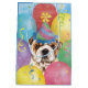 Feliz aniversário com este design com um lindo cachorro Bulldog, que veste chapéus, rodeado de balões coloridos, confetti e Streers.