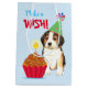 Feliz aniversário com este design bonitinho com um sorridente cachorrinho de Beagle vestindo chapéu de festa com um cupcake de aniversário. Feliz aniversário na frente e "Faça um Desejo!" nas costas. O texto pode ser facilmente alterado; basta clicar no botão personalizar.