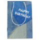 Texto de aniversário feliz sobre fundo de coloração cardíaca de denim azul com texto de costura pode ser editado ou excluído.